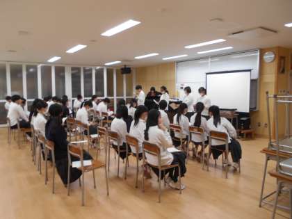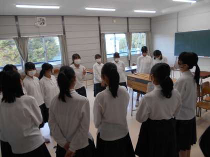 合唱練習終了後、反省会をしています。クラス全体で、パート別で、それぞれ成果と課題を振り返り、明日の目標を立てていました。