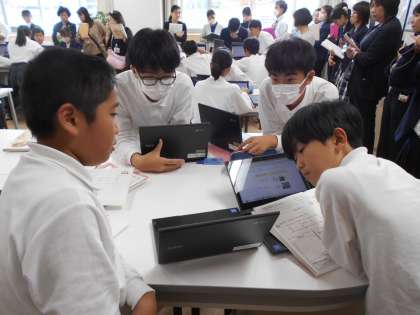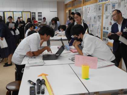 午後から本校で県中学校教育課程研究大会家庭部会が行われ、県東部の家庭科の先生方が研修しています。1年2組家庭科の研究授業では、「我が家の防災対策プロジェクト」について、子供たちが活発に話し合いました。