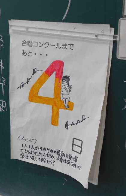合唱コンクールが近付き、盛り上げる掲示物が貼られるようになってきました。もう、あと4日ですね。悔いのないようにしっかりと歌いましょう。