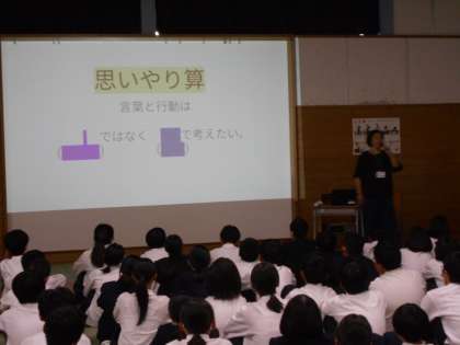 1学年は、学年集会を行い、相手の気持ちを考えることや思いやりについて、学年全体で考えました。