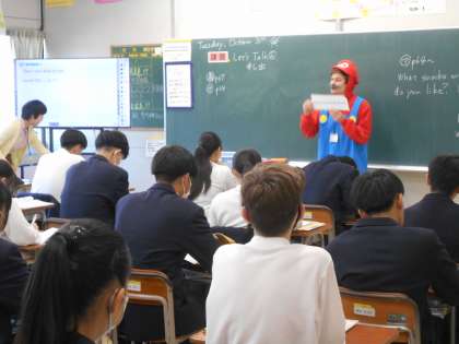 西部中にスーパーマリオ登場? ハロウィンなので、ALTの先生が仮装して授業されました。