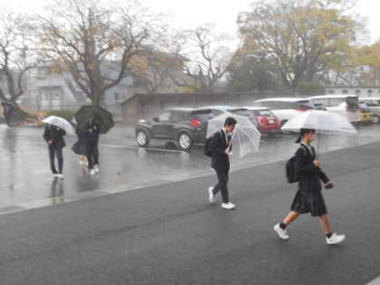 今朝の登校時、ほんの数分で天候が急変。横なぐりの冷たい雨となりました。冬がかなり近付いているように思います。登校前に天気予報や雨雲レーダーの確認が必要ですね。