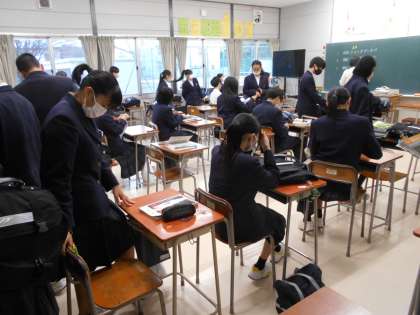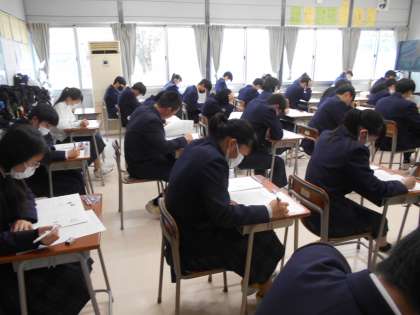 3年生は今日、明日と富山市中3学力調査に臨みます。出席番号順に並べ替えて座り、問題に集中して取り組んでいました。