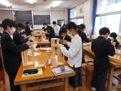 1組技術では、木製品がほぼ出来上がり、紙やすりで表面に磨きをかけていました。