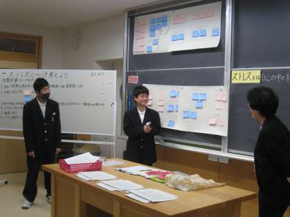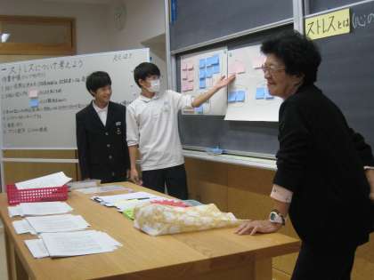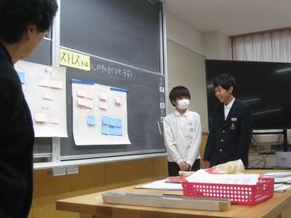 中学生の心をテーマに、生徒がスクールカウンセラーやスクールソーシャルワーカーから話を聞くことによって、自分の生活を振り返り健康な生活を実践するための意欲を高めました。生徒達は普段感じているストレスや、その解消方法をグループで話し合いました。