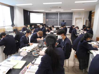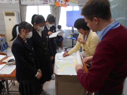 今日の1組英語にはALTの先生が参加。生徒たちは「日本の文化を紹介しよう」というテーマで作成した英文を、ALTの先生に点検してもらっていました。