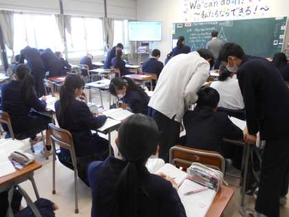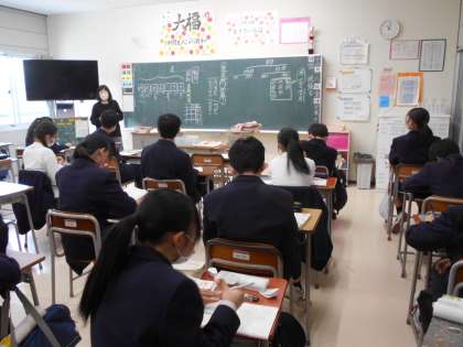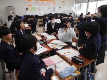 2組家庭では次回行う調理実習について、班で必要な食材等を調べました。献立は「豚のしょうが焼き」の予定です。