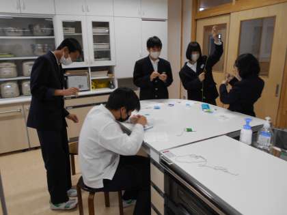 1組家庭では、針の穴への糸通しにチャレンジ。苦戦している人も。