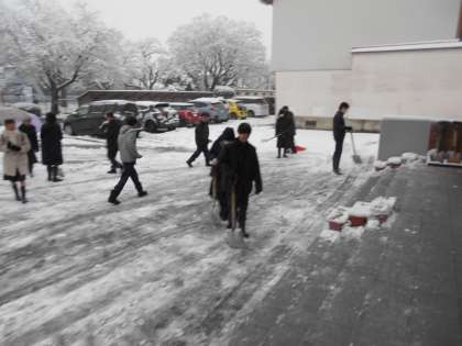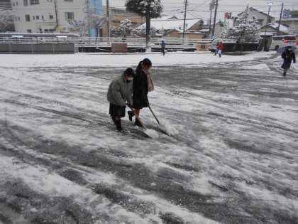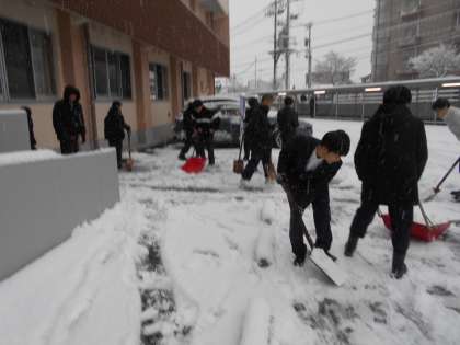 今シーズン初の積雪となった今朝、早く登校してきた生徒と野球部の生徒がボランティアで除雪作業をしてくれました。その後も登校してきた生徒が次々に加わり、生徒玄関前を中心に雪を取り除きました。とてもうれしい場面でした。