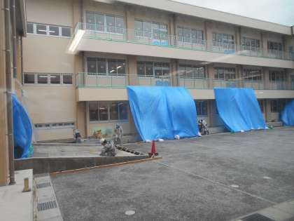 理科室からは新校舎に囲まれた中庭の様子を見ることができました。作業員の方が作業しておられましたが、もうかなり完成に近付いてきていました。
