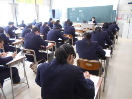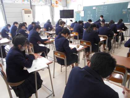 3年生は今日、実力テストを受けています。教室の張り詰めた雰囲気と皆の真剣な表情から受験に向けて頑張っている様子が伝わってきます。