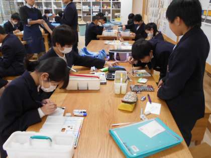 1組美術では、身の回りにある「大切なもの」を水彩で描く活動を行っていました。