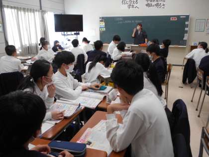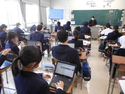 2組国語では、読む深めたい課題をクロムブックに入力し、生徒同士で共有し合いました。
