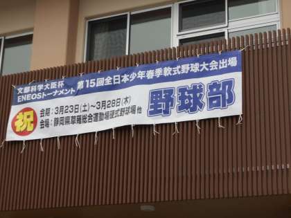 3/23(土)〜3/28(木)に静岡県で第15回全日本少年春季軟式野球大会が開催され、本校の野球部が富山県代表として出場します。その横断幕が完成し、生徒玄関に飾られています。大会の予定は以下になります。