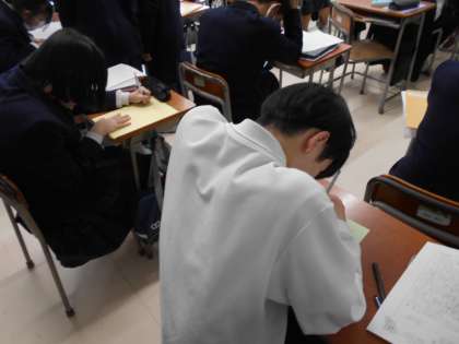 3組では、先日行われた「13歳のワークショップ」の講師の方々へのお礼状を書きました。分かったこと、学んだこと等を丁寧な字で感謝の気持ちを込めて綴っていました。