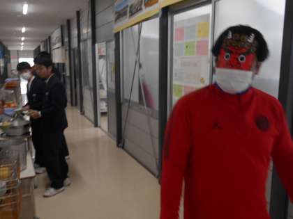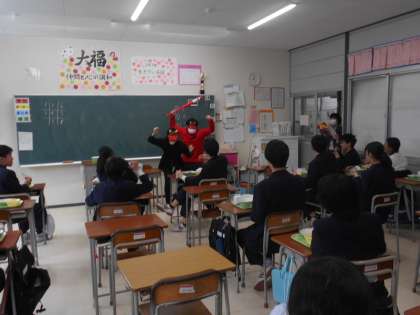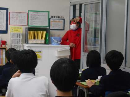 今日は節分です。西部中学校では、給食中の教室に鬼が現れました。