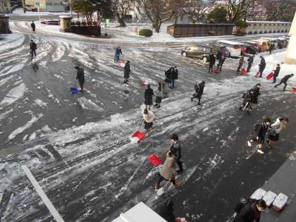 昨日(2/5)に降った雪で生徒玄関前にたくさんの雪が積もっていました。除雪当番のクラスの生徒やボランティアとして協力してくれた生徒たちが一生懸命に除雪をしてくれました。