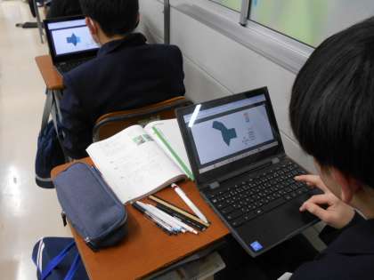 3組数学では、クロムブックでデジタル教科書の資料を活用しました。画面上で立体を切り取るとすぐに展開図ができ、とても分かりやすいです。