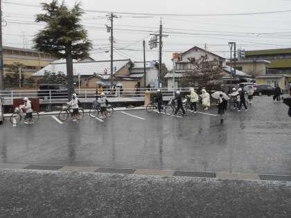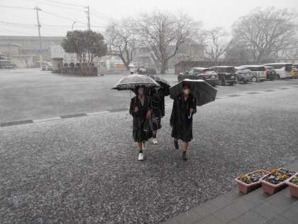 雪の予報も出ていたとはいえ、あっという間に路面は真っ白になりました。自転車通学生は自転車から降りて、登校していました。