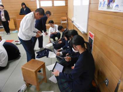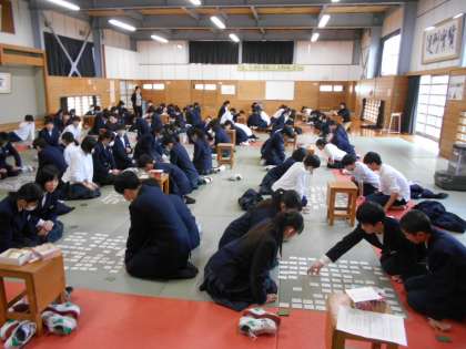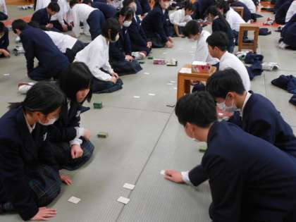 1年生は誠武館で百人一首大会を行いました。事前に練習会を行い、取り札の数で決めた、学級横断の実力別グループで競いました。