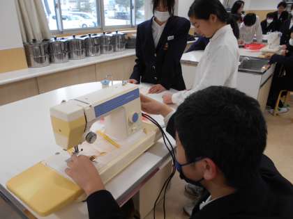 1組家庭では、ミシンがけに取り組みました。なかなかうまくいかず、あまり進まなかったようです。