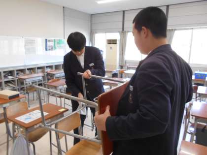 県立高校一般入試1日目のこの日、進路が確定している3年生が登校し、清掃、掲示物作成、メッセージ記入の3つのグループに分かれ、卒業に向けての作業を行いました。