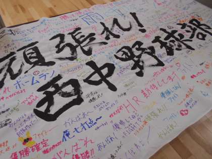 また、生徒玄関に設置されていた応援の横断幕へのメッセージ記入も、在校生や卒業生のメッセージでぎっしりと埋まりました。記入してくれた皆さん、どうもありがとうございました。この横断幕は全国大会のベンチ横のフェンスに張って、選手を激励します。