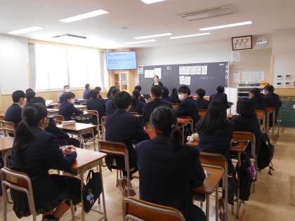 2組と3組の学活の様子です。3組では、先生の自己紹介を大型モニターでスライド形式で投影され、生徒から多くの質問が飛び交っていました。
