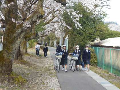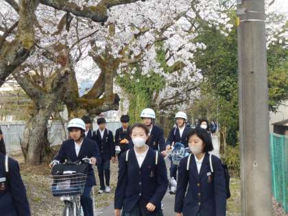 桜満開の並木道を生徒は登校しました。1年生の自転車通学生にとっては初めての自転車通学です。交通ルールを守り一列で通学していました。
