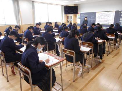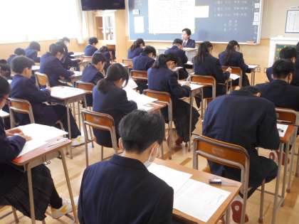 中学校入学後、初めてのテストに臨みました。黒板にはテストの受け方についての諸注意が貼られ、皆、真剣に問題に取り組んでいました。