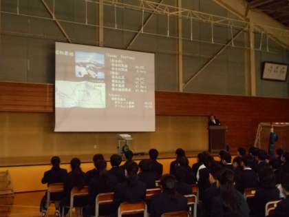 本校卒業生の木津暢彦さんに演題「日本のプライド、個人のモチベーション 〜日本南極地域観測隊の挑戦〜」を講演をしていただきました。南極観測隊越冬隊長として参加された経験をもとに、南極の気候や動物の様子、昭和基地の様子などを写真や動画を用いてわかりやすく説明していただきました。