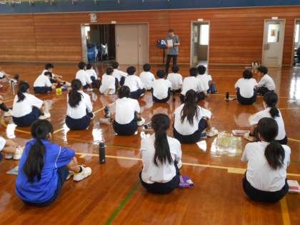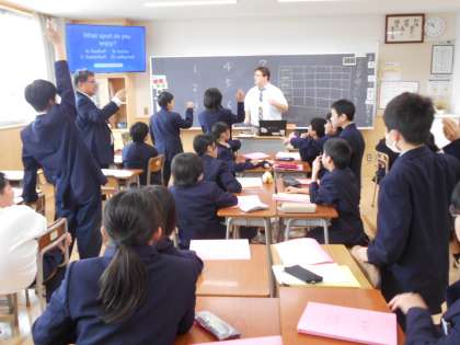 2組英語では、ALTの先生が作成した英会話クイズを班対抗で競って応えていました。とても楽しそうでした。