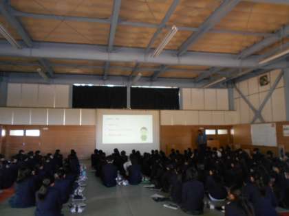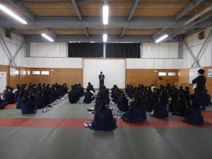 修学旅行についての学年集会を行いました。学年生徒会がスローガンの発表があり、続いて持ち物やきまりについての説明しました。今日は会に先立ち、学校生活のルールやマナーについて、一人一人見直そうという学年生徒指導担当からの話もあり、子どもたちは改めてルールやマナーが大切な理由について、理解を深めていました。