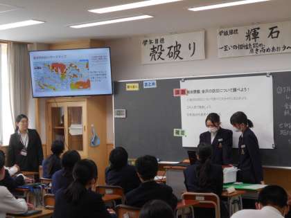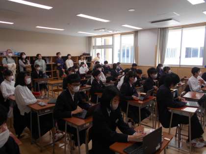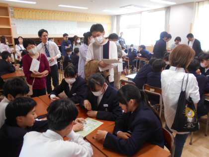 午後から授業参観を行いました。1年生は学級活動、2年生は総合的な学習の時間、3年生は担任が担当する教科の授業を行いました。校舎が完成して初めての授業参観でした。たくさんの保護者の皆さんが来られ、一緒に授業に参加する場面も見られました。