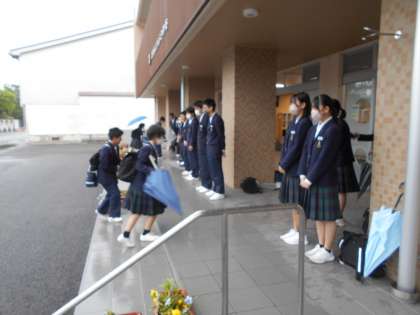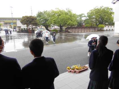 先日の生徒総会で前期生徒会執行部の活動計画が承認されました。今朝はその中の「あいさつ運動」が行われました。あいにくの雨でしたが、生徒会役員にボランティア参加の生徒が加わり、登校する生徒とさわやかにあいさつを交わしていました。