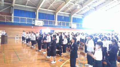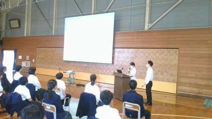 富山赤十字病院から看護師と保健師を招いて、1、2年生を対象とした「ふれあい看護体験」を行いました。前半には看護師や助産師、保健師の仕事内容を紹介していただきました。