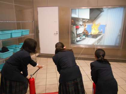 四季防災館では、震度1〜7の地震体験、消火器を使っての消火体験、煙の中を避難する煙体験をしてきました。家庭科や総合的な学習の時間で学んだ防災学習を体験することでより実態に迫った学習になりました。