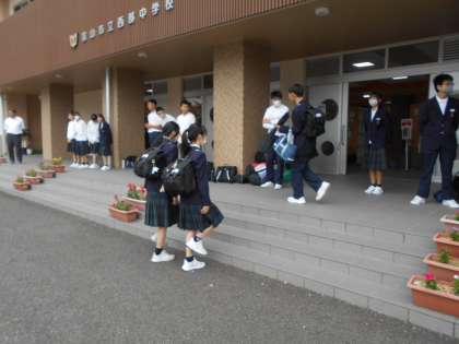 先週の地域ぐるみあいさつ運動に続いて、今週は生徒会のあいさつ運動です。毎週月曜日に生徒会執行部、当番学年の学級代表、ボランティア生徒によって行われています。これからも活気のある朝をよろしく!