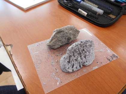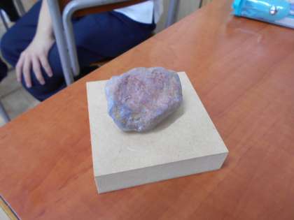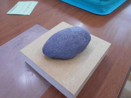 写真は2年1組の人たちの作品、2つ並んでいるのはどちらかが本物の石です。