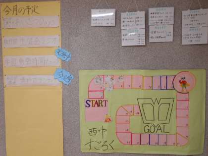 生徒玄関入ってすぐ右の掲示板に、生徒会コーナーがあります。執行部や委員会の取組への参加状況に応じて、各クラスにポイントが加算され、クラス対抗で頑張っている様子がすごろくに表されます。