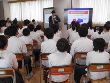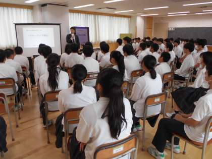 「社会に学ぶ『14歳の挑戦』」に向けて、菅公学生服(株)の方を講師に招き、着こなし講座を行いました。服装が整っている人とそうでない人の印象の違い等、普段の生活にも生かせるお話でした。