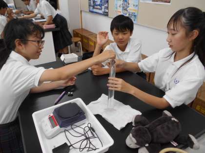 2組理科は、物体の体積を求めようと、物体を水の入ったメスシリンダーへ慎重に投入していました。