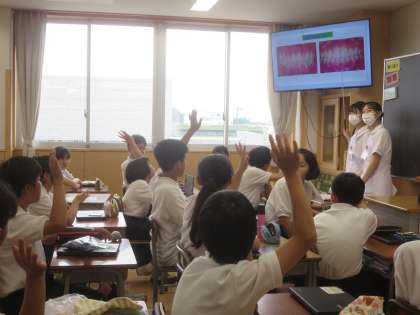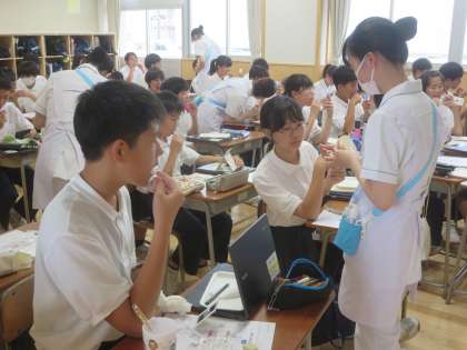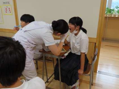 富山歯科総合学院の学生さん約30名が訪れ、1年生を対象に歯科衛生講座が行われました。講座は歯科衛生士を目指す学生さんの実習を兼ねており、生徒たちは口腔内の衛生について学ぶとともに、歯科衛生士への道を垣間見たのでした。