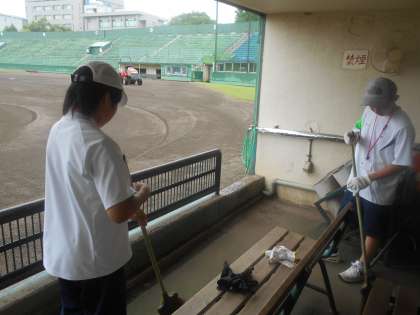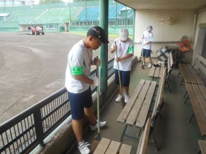 三人で県営球場の清掃をしました。日頃、大会で使用している野球場に感謝の気持ちを込めて掃除をすることができました。