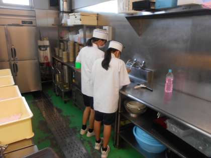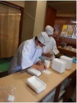 寿司づくりや容器づくり等のやり方を教えてもらいながら、初めての体験を頑張っていました。3日目も保護者ボランティアの方2名に巡回をしていただきました。子どもたちが頑張る姿を写真で撮るだけでなく、励ましの声掛けもいただきありがとうございます。