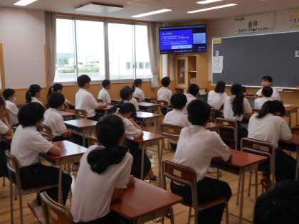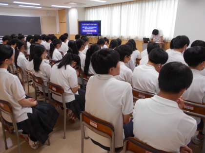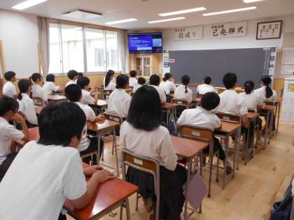 1学期の終業式はオンラインで行われました。1、2年生は各教室で、3年生は多目的室に集まり、校長先生の式辞や生徒指導主事の話を聞きました。