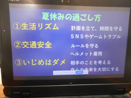 「生活のリズム」「交通安全」「いじめはダメ」について具体的に説明しました。夏休みを安心・安全に過ごし、充実した夏休みを過ごしましょう。