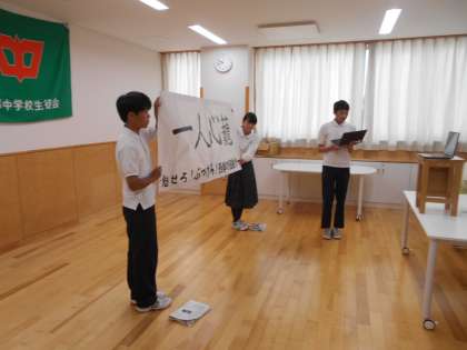 9月19日実施の第78回体育大会の結団式をリモートで行いました。実行委員から体育大会スローガン「一人心籠」(めいめいしんろう)が発表されました。「一人一人が心を籠めて活動に取り組み、目標達成を目指そう!」という意味です。西中生全員で素晴らしい体育大会をつくりあげましょう。