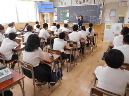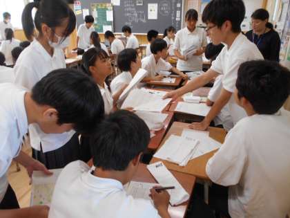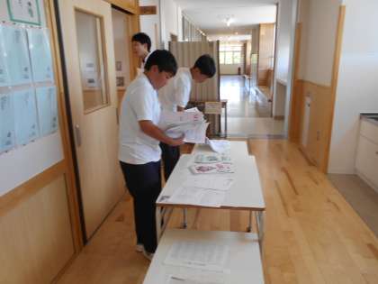 数多くの夏休みの宿題は集めるだけでも時間がかかります。グループで課題の提出をチェックしたり、順番に各自が配膳台に提出したりするなど、どのクラスも工夫していました。