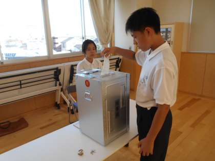 1年生は初めての生徒会役員選挙。オンラインによる立会演説会に続いて、本物の記載台、投票箱を利用しての投票を行いました。